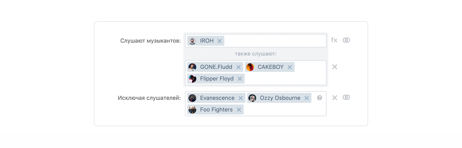 Теперь в рекламном кабинете есть поле «Слушатели музыкантов». Чтобы настроить таргетинг, нужно вписать туда названия исполнителей. Рекламодателям уже доступен выбор из более 50 тыс. музыкантов. Также можно показывать объявления тем, кому нравятся сразу несколько исполнителей, или исключить из подборки некоторых слушателей.