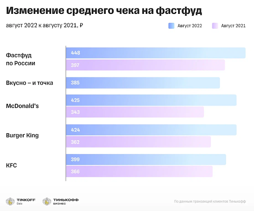 Burger King стал лидером по величине среднего чека среди остальных сетей — в августе 2022 года поесть в ресторане в среднем стоило 424 руб. По сравнению с августом 2021 года средний чек вырос на 10%. В KFC средний чек составил 399 руб., а во «Вкусно — и точка» — 385 руб.