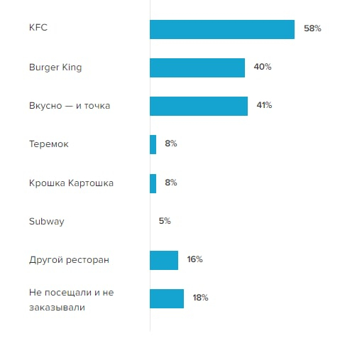 Хотя аудитория невысоко оценила новый дизайн упаковки, популярность ресторана быстрого питания не снизилась. В Tiburon Research опросили россиян, какие фастфуды они посещали (или заказывали еду) за последний месяц. В опросе «Вкусно — и точка» вместе с KFC и Burger King с большим отрывом заняли первые три места по популярности.