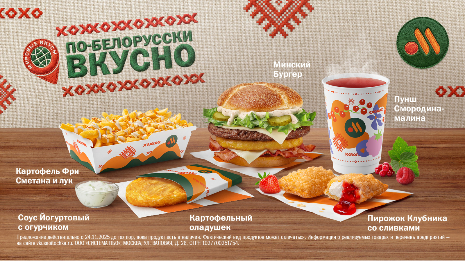 Во всех предприятиях сети можно попробовать новинки с белорусским характером. Главный герой — Минский бургер с картофельным оладушком, беконом и новым соусом «Сметана и укроп». Что? Картофельный оладушек в бургере? Не верыцца! Но это правда.