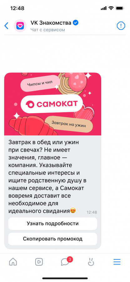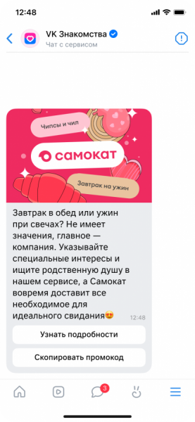 Команда предложила пользователям поощрение за знакомства внутри кастомной подборки. При мэтче с тем, у кого тоже установлены интересы от «Самоката», пользователи получали в чате промокод на скидку в онлайн-ретейлере — и на первые, и на повторные заказы. А после совершения заказа с этим промокодом пользователи автоматически принимали участие в розыгрыше призов — месяц Premium в «VK Знакомствах» и 1 500 руб. на заказ в «Самокате».