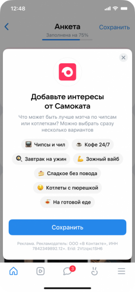 Формируя эти категории, команда опиралась на внутреннюю экспертизу обоих сервисов. В «VK Знакомствах» много любителей как спортивного образа жизни, так и более расслабленного. А в «Самокате» можно заказать готовые блюда, десерты, напитки, снеки. Сервисы соединили эти паттерны и предложили спектр вариантов, которые максимально точно отражают разные привычки молодых пользователей.