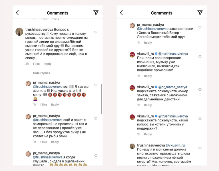 Клиенты сети магазинов «Вкусвилл» пожаловались, что во время ожидания на горячей линии играла песня со словами: «Легкой смерти тебе, мой друг». Пользователи сообщили об этом в комментариях под постом компании в Instagram.