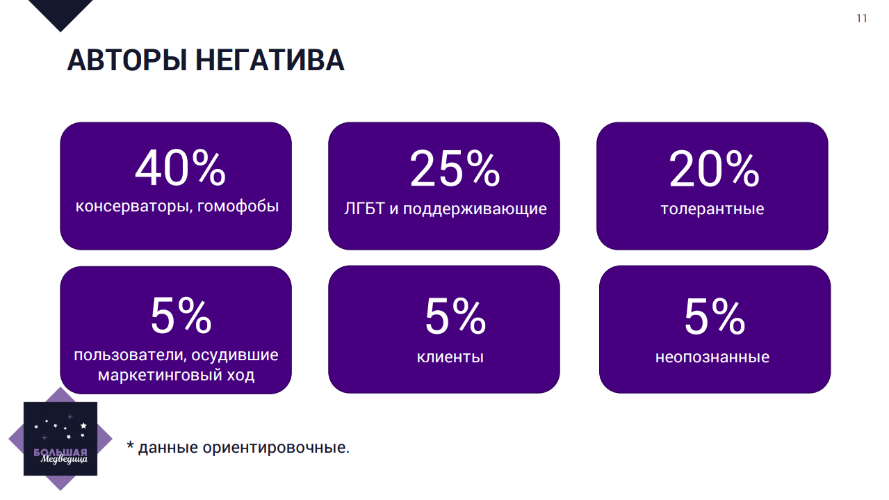 Также было выявлено, кто писал больше всего негативных постов и комментариев: 40% пришлось на гомофобную аудиторию, 25% — на ЛГБТ и поддерживающих их пользователей, 20% — на толерантных.