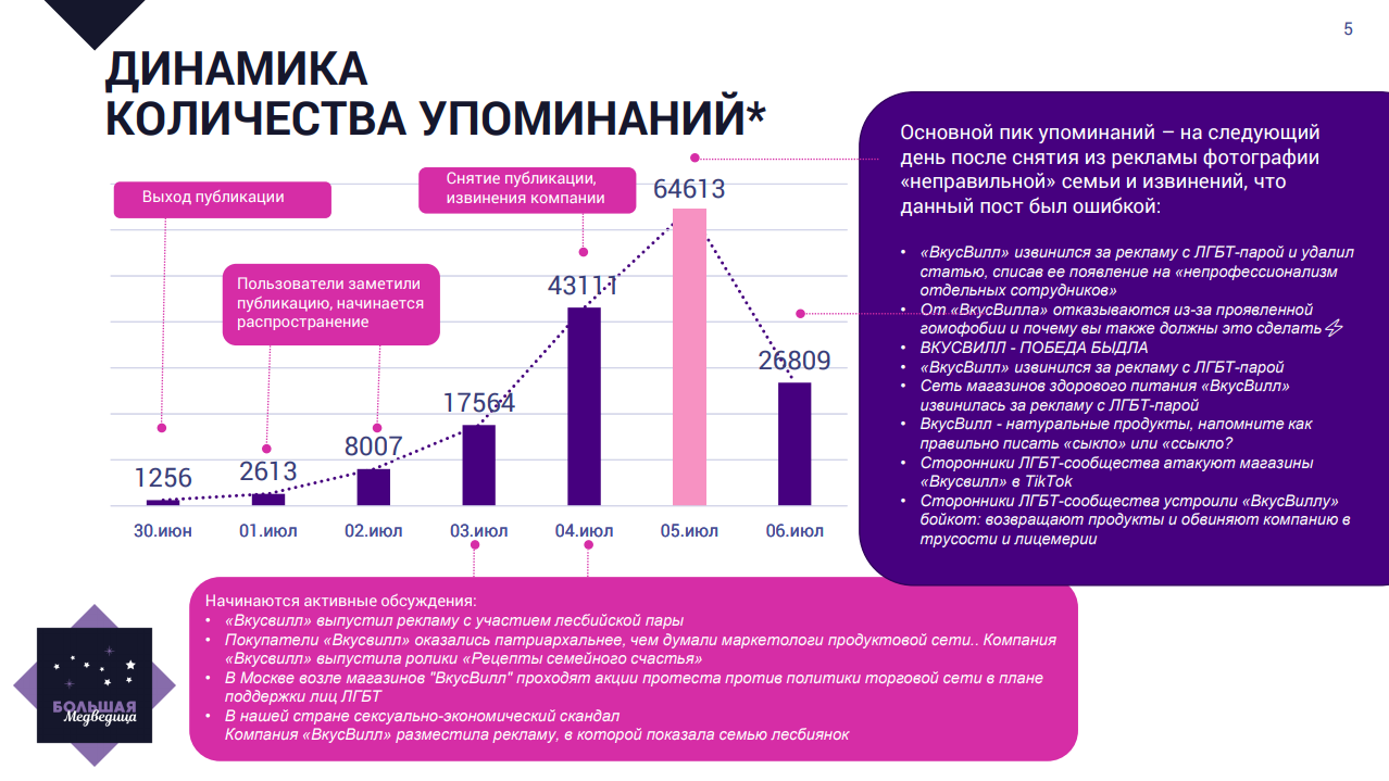 Агентство по управлению репутацией и коммуникациями «Большая медведица» опубликовало исследование, в котором показало, как выросли упоминания и охваты пользователей в связи со скандальными публикациями промо «ВкусВилла». Согласно данным системы мониторинга YouScan, больше всего негатива ритейлер получил после извинений и снятия статьи с квир-семьей. Итоги исследования имеются в распоряжении Sostav.