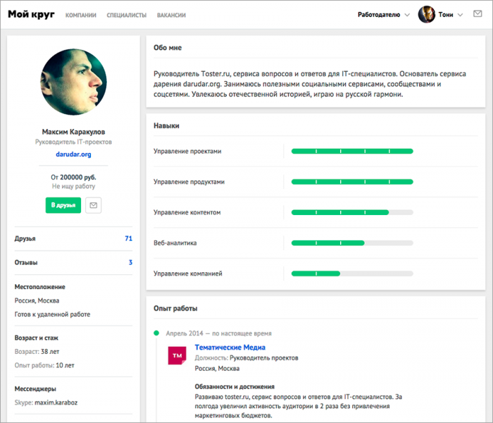 Компания «Тематические Медиа» стала новым владельцем сервиса «Мой круг» и уже представила обновленную версию сайта. Теперь «Мой круг» не является социальной сетью: на первый план вышла возможность работодателям и соискателям находить друг друга, одновременно была сужена тематика — до IT-индустрии, куда входят программирование, верстка, дизайн, менеджмент, веб-аналитика, маркетинг и другие.