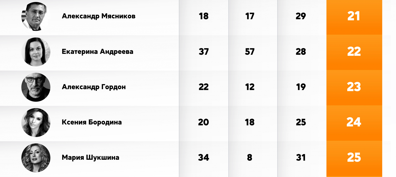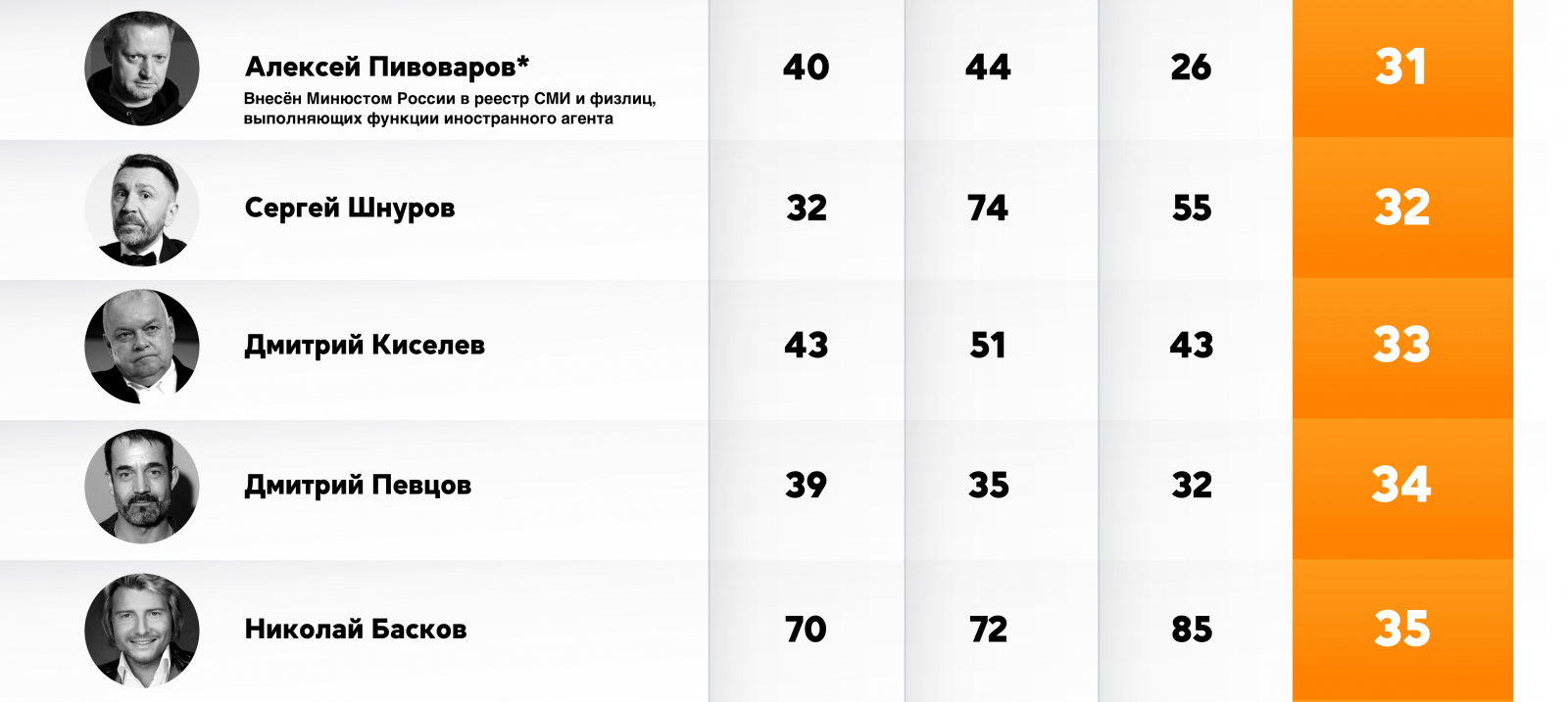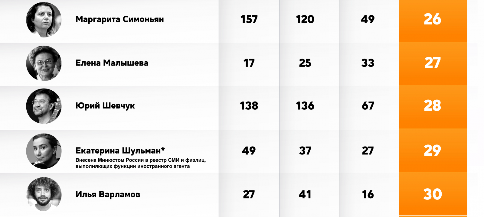 Актёр и общественный деятель Константин Хабенский, лидер рейтинга 2021 года, теперь занимает четвертую позицию. На две строчки опустился и телеведущий Дмитрий Нагиев — он занял пятое место в летнем рейтинге. Теряет позиции и блогер Юрий Дудь (внесён Минюстом в реестр СМИ-иноагентов).
