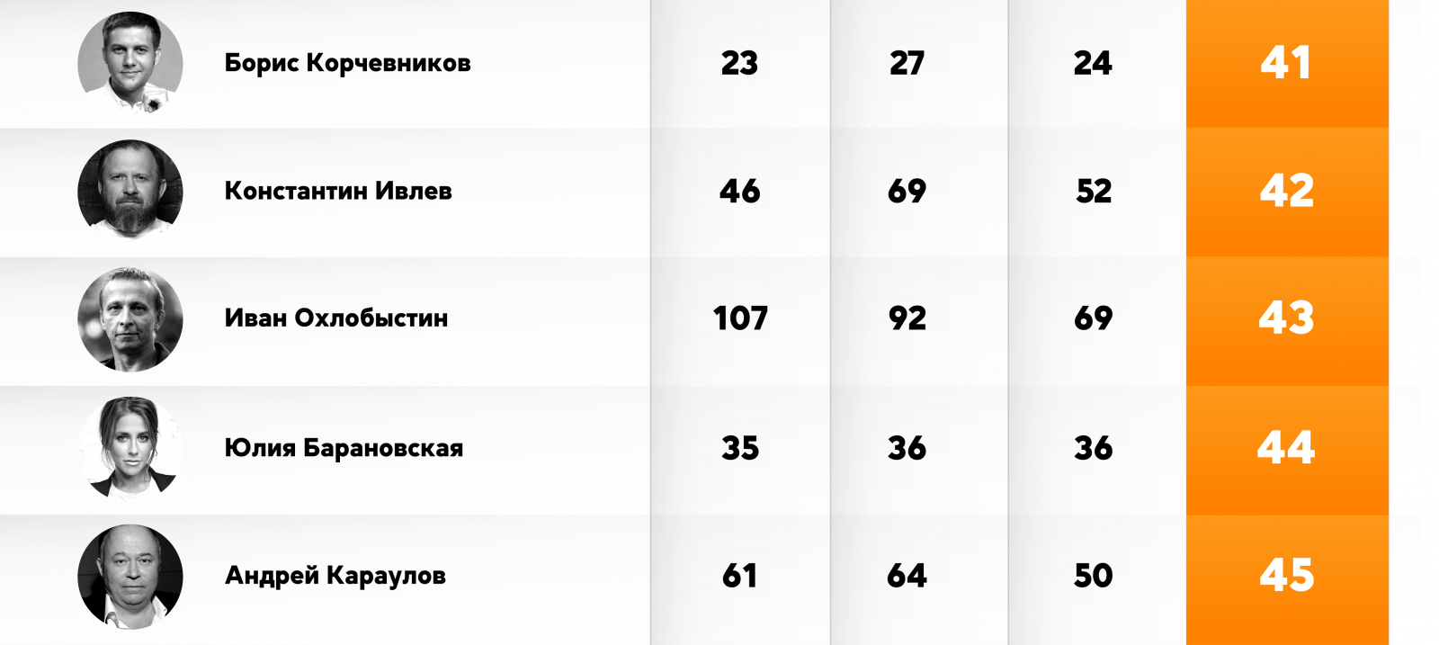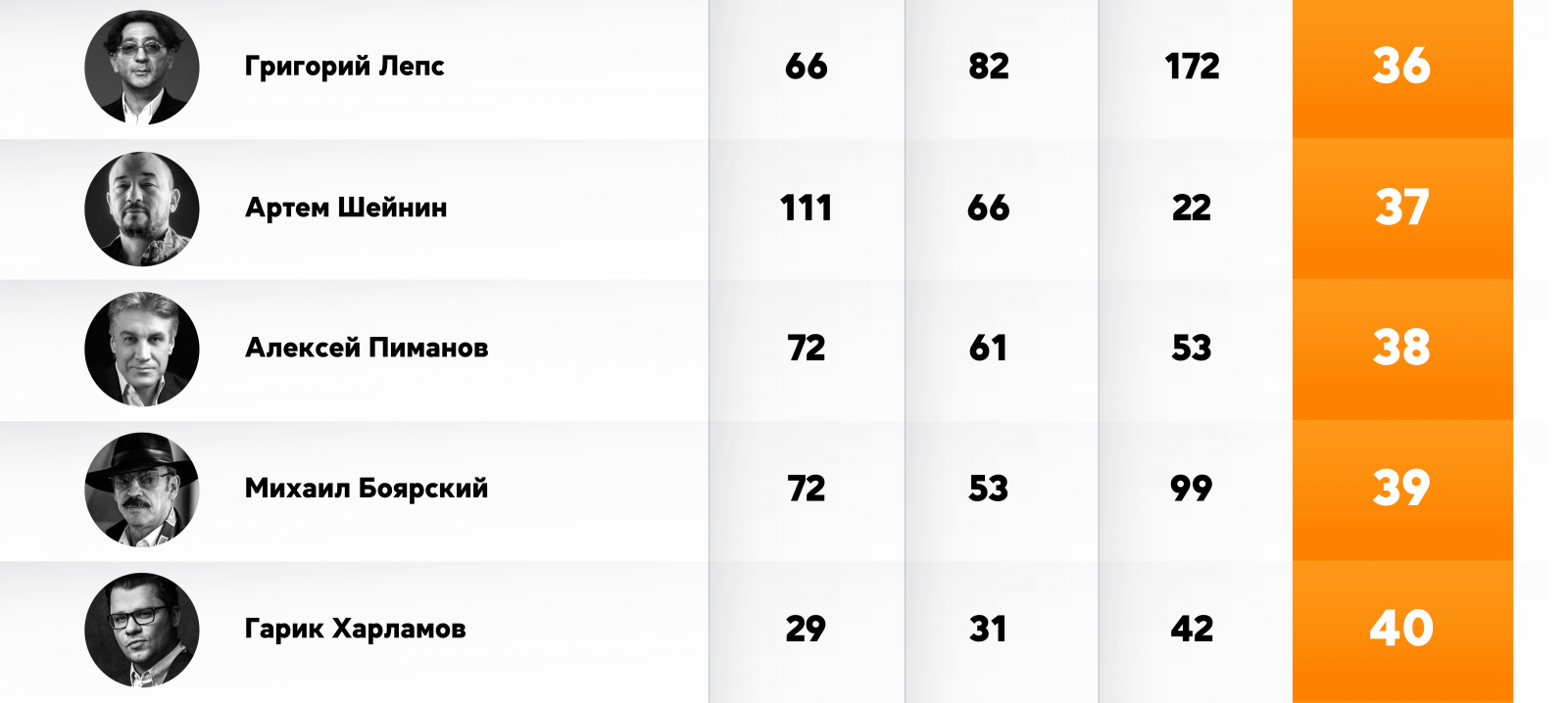 Самый большой рост относительно прошлого сезона среди топ-50 инфлюенсеров показал музыкант Григорий Лепс. Три сезона подряд артист терял позиции в рейтинге, а в летнем сезоне поднялся с 172 на 36 место. Антирекорд в рейтинге принадлежит актеру и телеведущему Борису Корчевникову — с 24 места он спустился на 41-е.