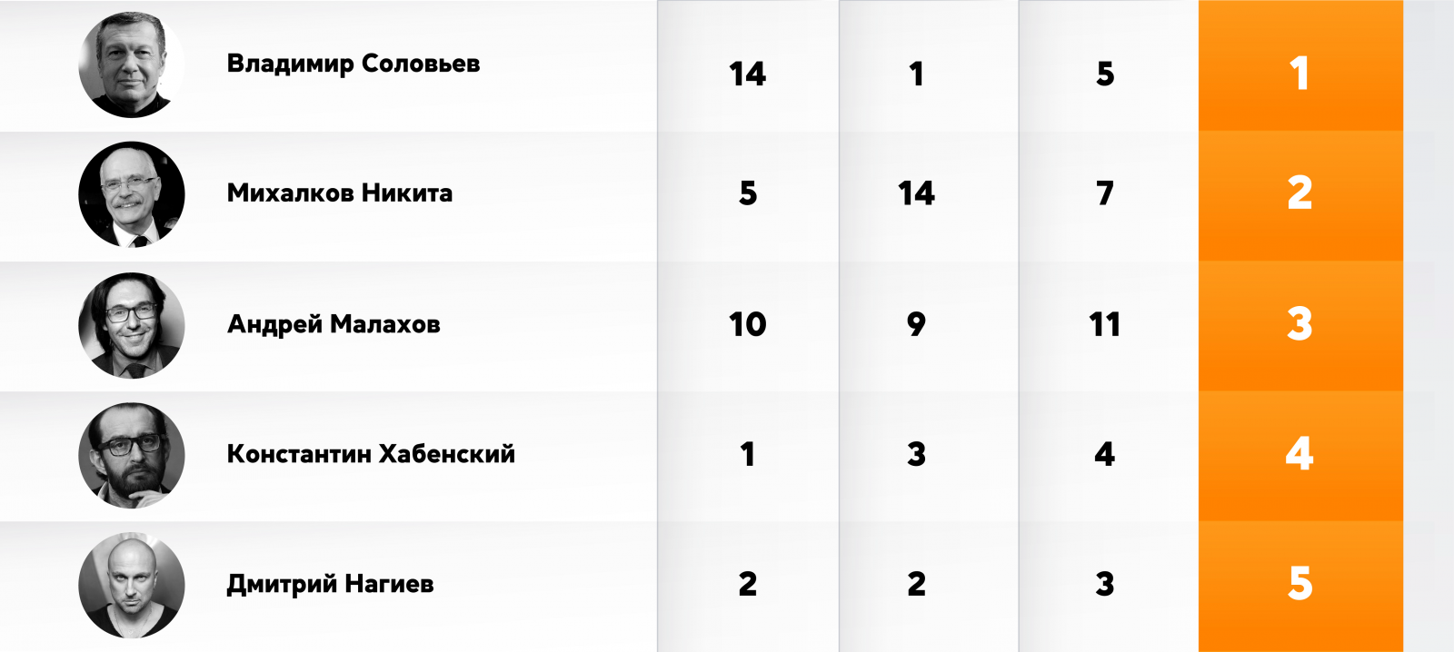 Журналист и телеведущий Владимир Соловьев возглавил топ-50 «Рейтинга инфлюенсеров» за летний сезон 2022 года. Он восстановил свою позицию после ухода на пятое место в весенний период. Второе место занял режиссер Никита Михалков, а третье — Андрей Малахов. К таким выводам пришёл исследовательский холдинг «Ромир» по итогам ежеквартального исследования.