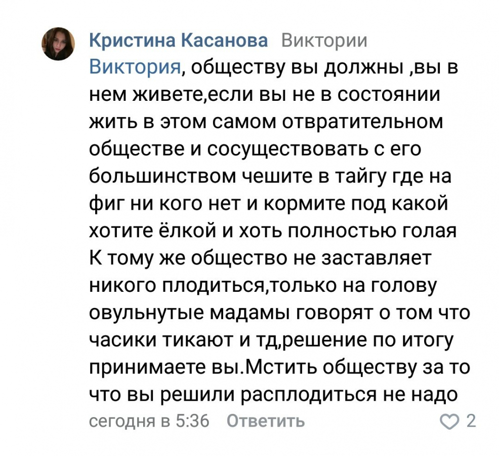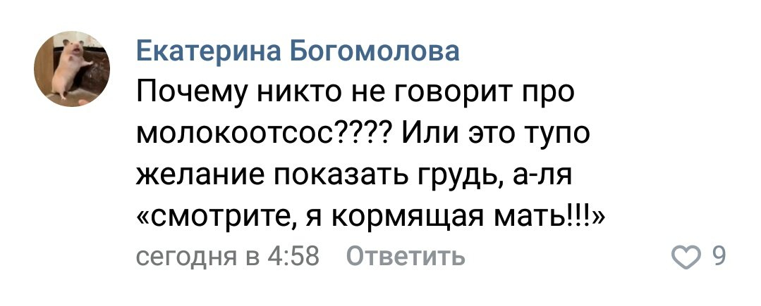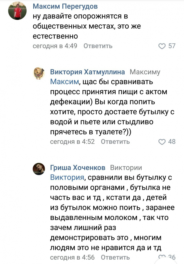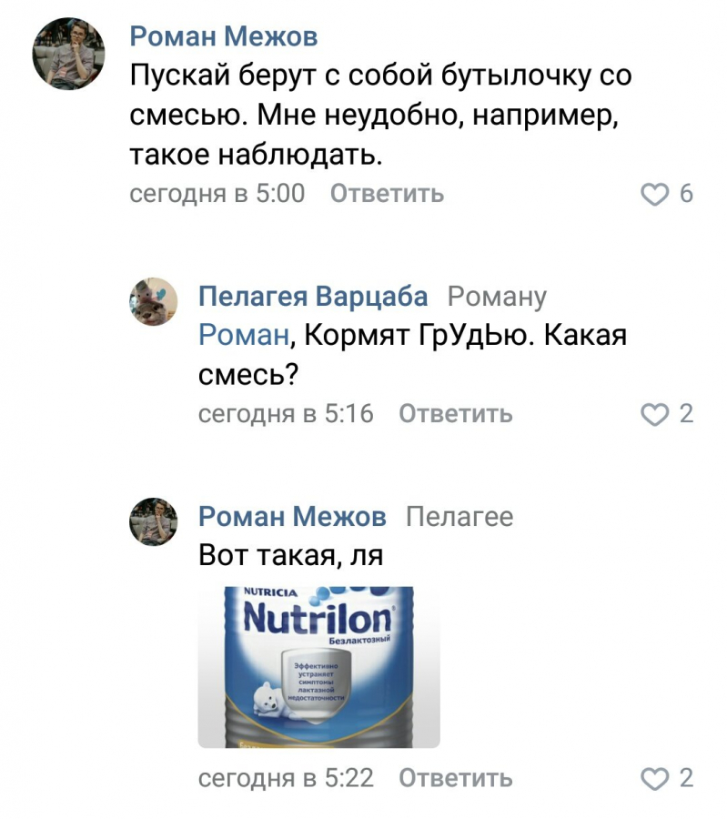 Защищать девушек и поддерживать грудное кормление в общественных местах многие, разумеется, не стали. В своих комментариях пользователи сравнивали этот процесс с «опорожнением», «местью обществу» и «желанием показать грудь». Женщинам даже предложили уйти в тайгу, где, по их мнению, под елкой можно кормить даже голыми.