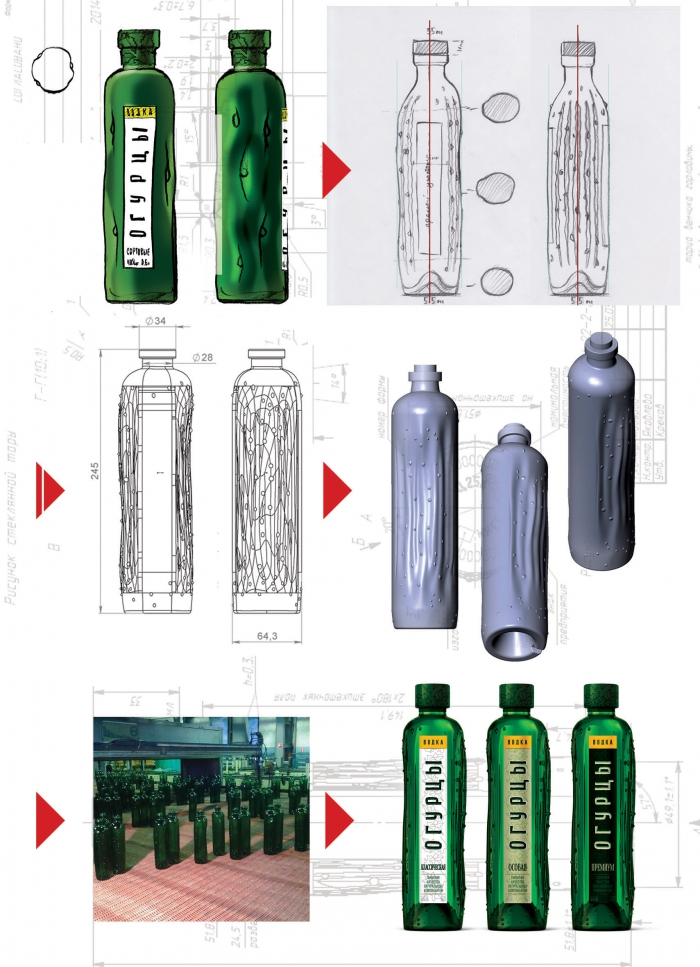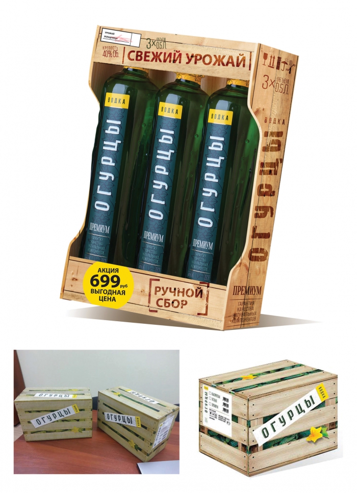 Помимо юмора, среди характеристик бренда можно выделить сильную экологическую и природную составляющую - внешний вид продукта вызывает доверие качеству водки, считают авторы проекта. «Огурцовая» концепция органично связывает все разработки по упаковке водки, промо и рекламных материалов: в основе рецептуры водки - спиртованный настой свежих огурцов; уникальное формообразование бутылки выполнено в виде натурального зеленого огурца с пупырышками; оригинальные гофрокороба мимикрируют под деревянные ящики для огурцов, фирменные промостойки сделаны в виде всем знакомых «рыночных» конструкций - из деревянных лотков и ящиков.