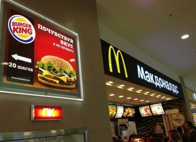 В этом же году активная война между конкурентами разгорелась и на российском рынке. Тогда появился рекламный ролик компании Burger King, в котором флагманский продукт сети — гамбургер «Воппер» — давит собой цветок мака, а закадровый текст сообщает: «Это мак. Когда-то он был популярен, но его время прошло!». В эфир основных каналов реклама не была пропущена.