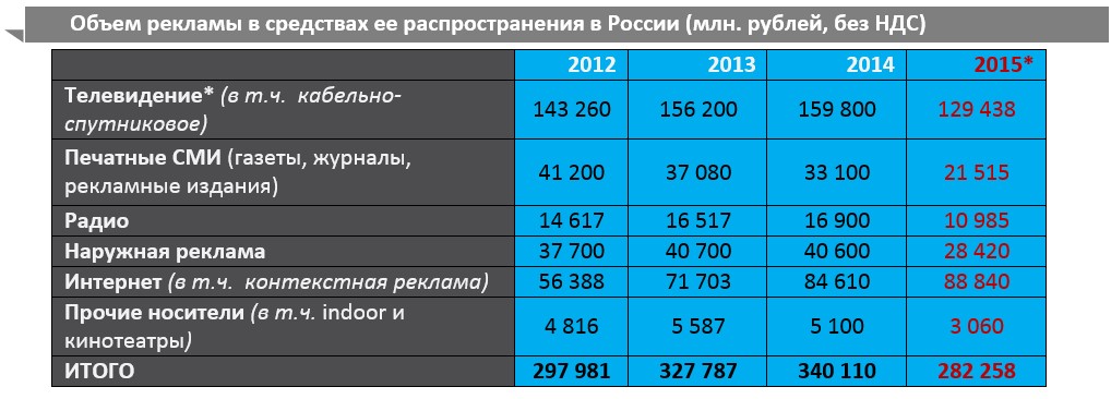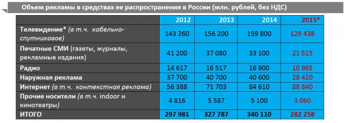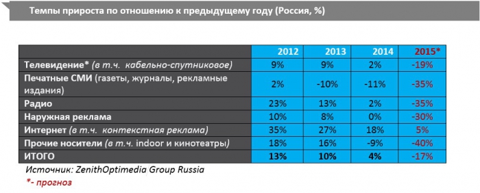 Что касается перспектив развития российского рекламного рынка, ZenithOptimedia оставила в силе свой предыдущий прогноз - снижение объемов рынка на 17% в 2015 году по отношению к 2014 году.