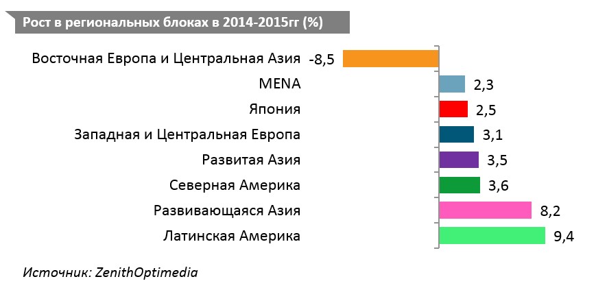 По новому прогнозу ZenithOptimedia, глобальный рекламный рынок в 2015 году вырастет на 4,2% по сравнению с прошлым годом (в предыдущем прогнозе, выпущенном в марте 2015 года, было 4,4%) и достигнет 531 млрд. долларов. Прогноз относительно развития российского рекламного рынка оставлен без изменений - в текущем году его объем сократится на 17%. В минусе Белоруссия, и совсем катастрофическая ситуация складывается на Украине. Причина упадка региона в вооруженном конфликте, бегстве инвесторов и войне санкций.