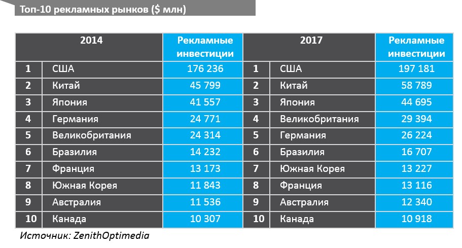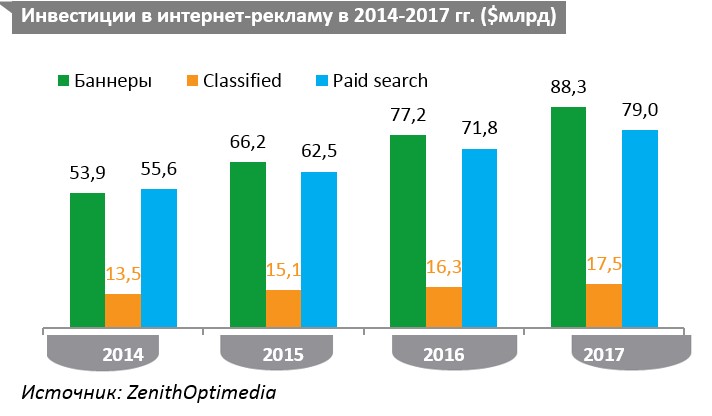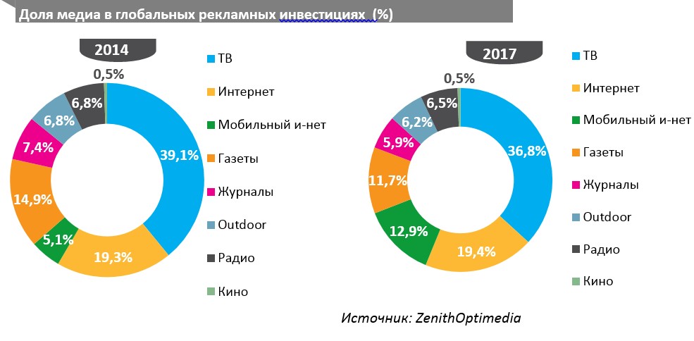 Согласно новому прогнозу ZenithOptimedia, в 2017 году интернет станет крупнейшим по объему рекламных инвестиций медиа на 12 крупнейших мировых рекламных рынках, которые вместе представляют 28% общемировых расходов на рекламу. В четырех из них интернет реклама привлечет более 50% всех рекламных инвестиций. Несмотря на это, на глобальном уровне, интернет продолжит оставаться вторым по объему медиа после ТВ, однако, разрыв между этим двумя медиа сократится с 11% в 2015 году до 4% в 2017.