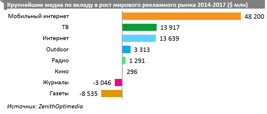 Развитие мобильного интернета продолжает оставаться основным драйвером роста глобальных инвестиций в интернет-рекламу. В период с 2014 по 2017 гг. Мобильная интернет-реклама удвоит свою долю в общемировых расходах на рекламу по всем медиа – с 5,1% до 12,9%, соответственно. Мобильная реклама также будет являться основным поставщиком новых инвестиций для мирового рекламного рынка – ее доля в росте глобального рынка составит 70% в период с 2014 по 2017 гг.