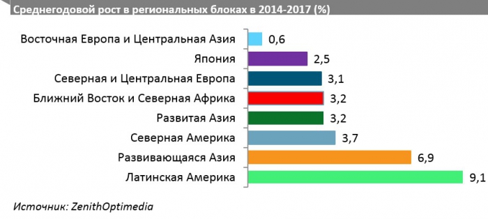 Низкие цены на нефть, негативным образом повлиявшие на развитие экономики в странах Латинской Америки, заставили нас снизить прогноз относительно рекламного развития этого региона в 2015 году с 11,4% до 8,4%. Однако, несмотря на это, Латинская Америка остается одним из наиболее динамично развивающихся регионов мира. Вровень с ней идут Азиатские страны, выделенные нам в группу “Fast-track Asia” – Китай, Индия, Индонезия, Малайзия, Пакистан, Филиппины, Тайвань, Таиланд и Вьетнам. Этот регион также является главным двигателем глобального роста с прогнозируемой среднегодовой динамикой по 9,1% год в период между 2014 и 2017 гг.