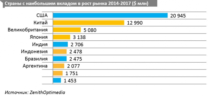 На данный момент интернет является крупнейшим медиа уже на семи рекламных рынках мира – в Австралии, Канаде, Дании, Голландии, Норвегии, Швеции и в Великобритании. В 2017 году к этому списку присоединятся Китай, Финляндия, Германия, Ирландия и Новая Зеландия. В Великобритании, Дании, Швеции и Китае в 2017 году доля интернет рекламы превысит 50% от всех рекламных расходов в каждой из стран.