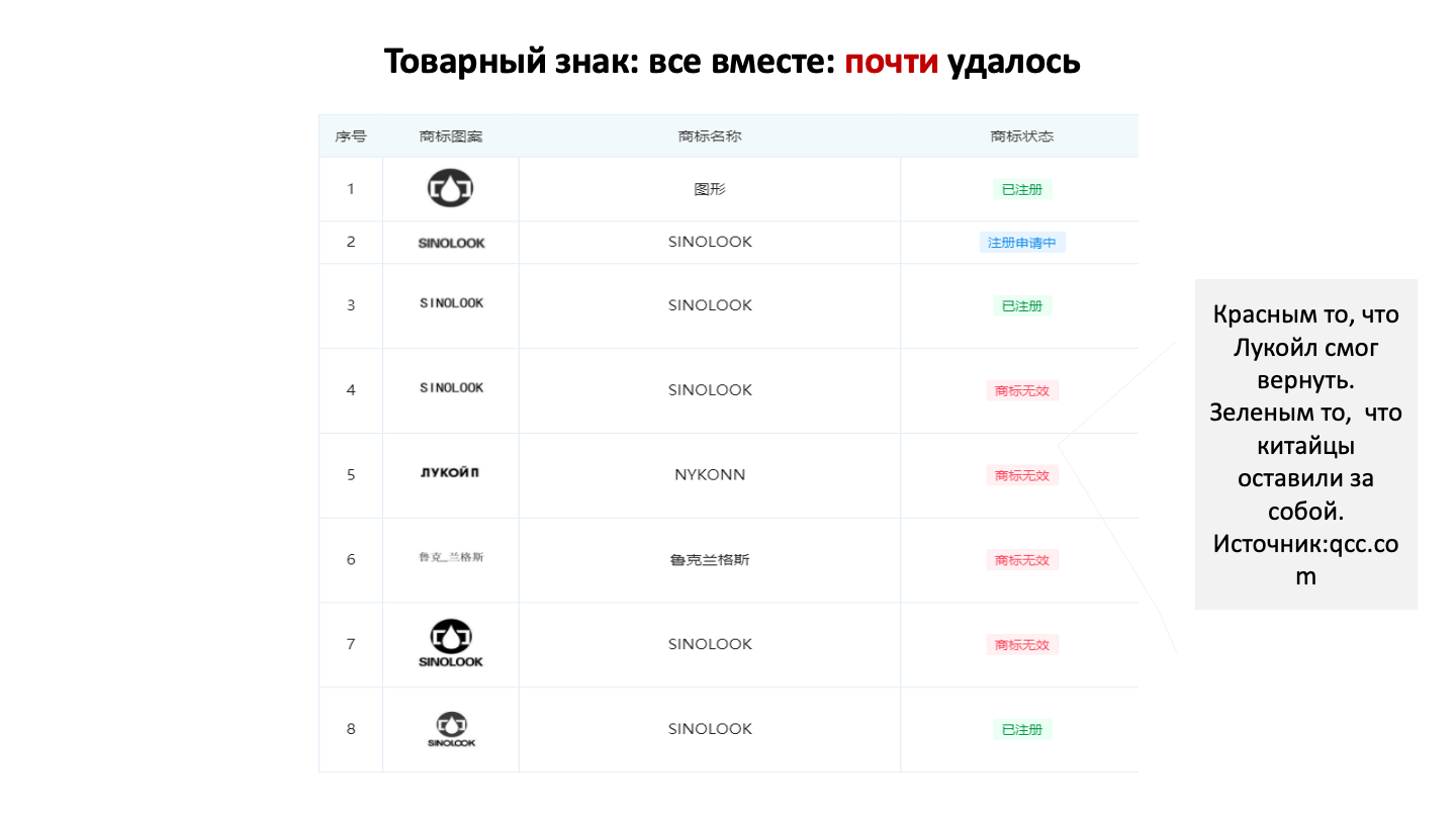 С аналогичной проблемой столкнулся «Лукойл»: официальный дилер компании Xiamen Sinolook Oil Co. Ltd пользуясь статусом решил выпускать свой продукт, внешний вид которого очень напоминал продукцию «Лукойла». Китайский партнёр зарегистрировал на себя несколько промышленных образцов канистр российской компании, китайские написания географических составляющих акронима «л у к ойл», а также несколько товарных знаков с вариациями названия. В связи с этим российский «Лукойл» некоторое время не мог продавать свои продукты с этими товарными знаками без разрешения злоумышленников.
