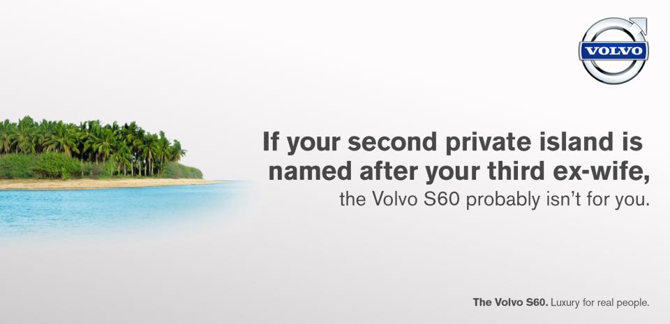 Цифровой маркетинг новой кампании раскрывается в рекламе на Facebook. На одном из принтов изображена маленькая собака чихуахуа в свитере, рядом с которой красуется надпись: «Если у вашей собаки есть шкаф для одежды, Volvo S60, вероятно, не для вас». Слоган на другой картинке гласит: «Если ваш второй частный остров назван в честь третьей бывшей жены, Volvo S60, вероятно, не для вас».
