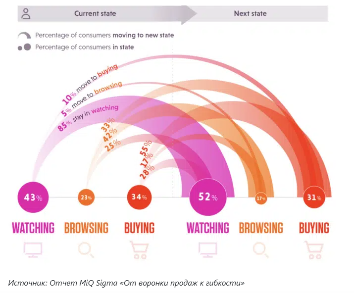 Поведение потребителей становится все менее предсказуемым. Так, 86% пользователей переключаются между цифровыми активностями как минимум раз в час, а 42% описывают свой путь к покупке как случайный. Это делает классическую воронку продаж все менее применимой на практике, сообщает MarTech со ссылкой на отчет MiQ Sigma.