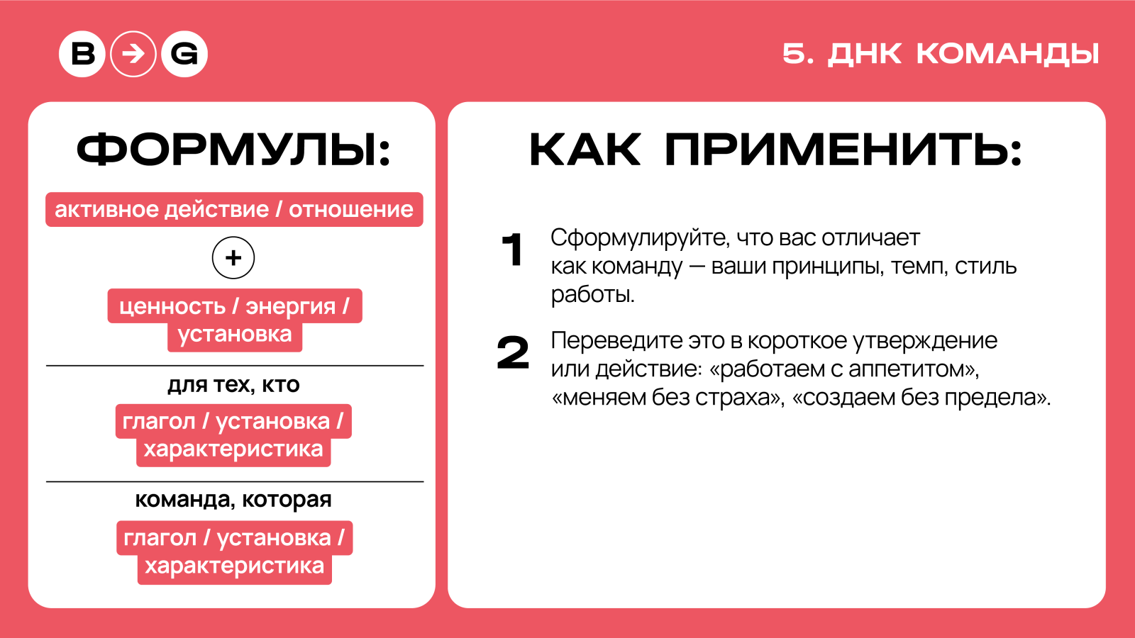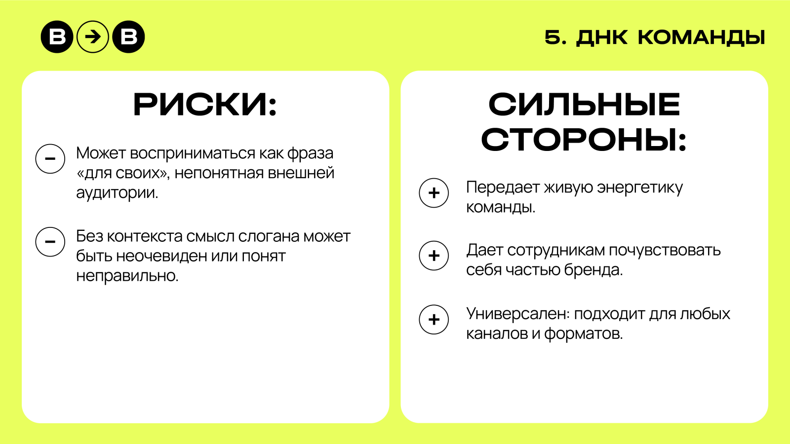 Фиксируют способ существования компании — «мы такие», «у нас так принято». Отражают ДНК команды: ее энергию, подход, отношение к изменениям. В отличие от слоганов-утверждений, которые про систему ценностей, ДНК говорит о людях, их характере и взаимодействии. Такие слоганы одинаково хорошо работают во внешнем HR-бренде и внутри компании — в манифестах, брендбуках и коммуникации с сотрудниками.