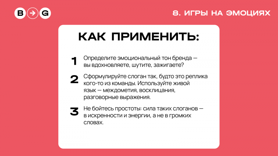 Здесь главным инструментом становится интонация. Такие слоганы заражают эмоцией и звучат как реплика сотрудника, а не строчка из брендбука. Работают, когда нужно показать энергию, человечность и характер компании. Этот подход появился относительно недавно — как реакция на избыток формальных корпоративных сообщений.