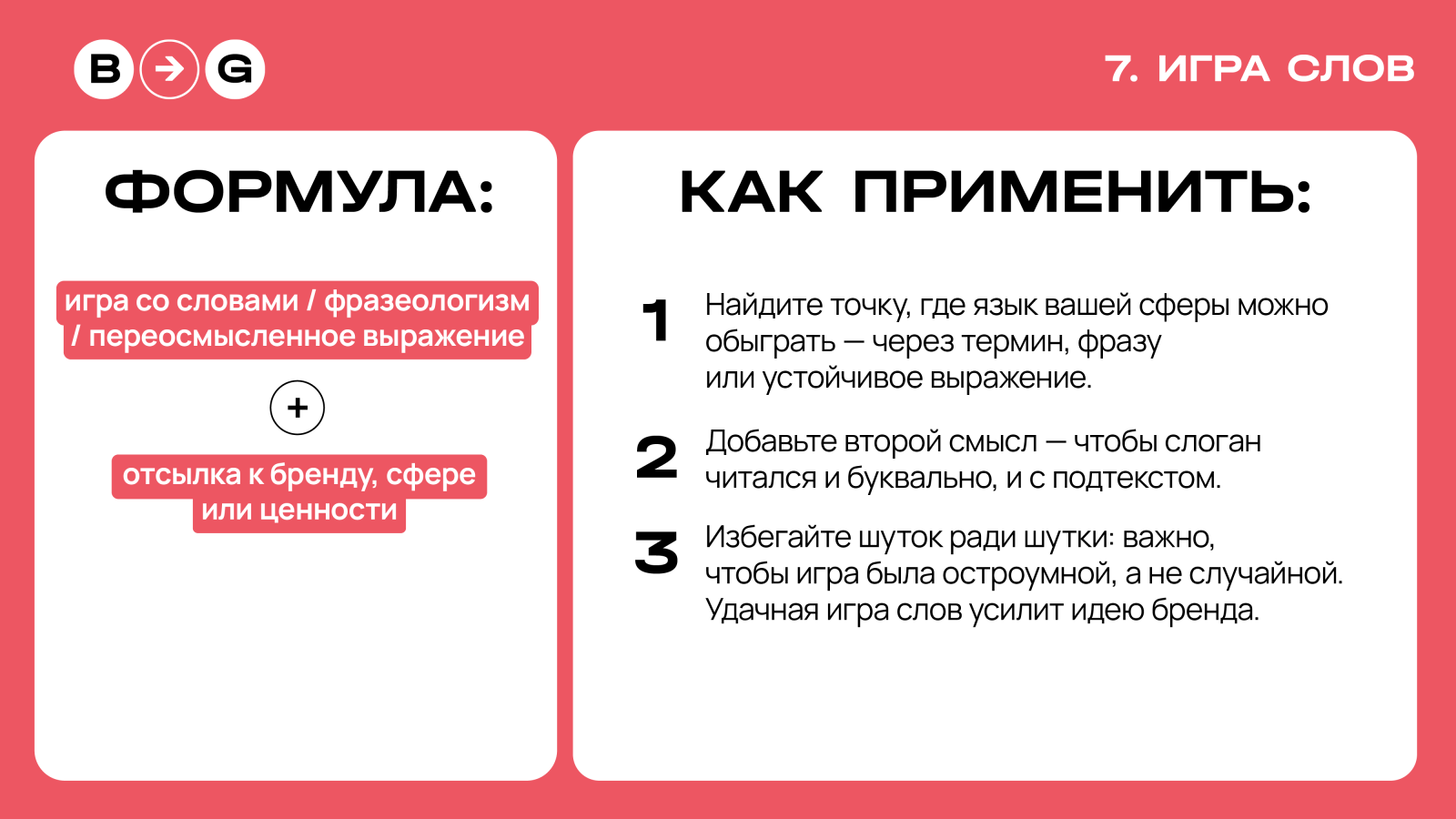 Это слоганы с двойным смыслом, основанные на каламбуре и переосмыслении знакомых выражений. Они работают в двух уровнях: буквальном (о продукте) и метафорическом (о ценностях и философии), что делает их запоминающимися и приятными за счет «догадки». Формулу можно сочетать с другими видами слоганов для креативности и лучшего запоминания.