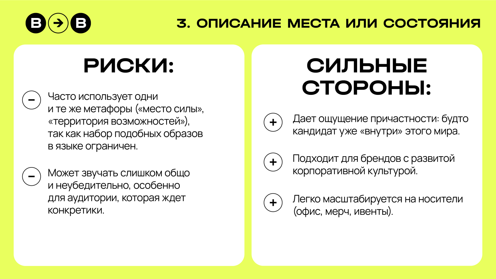 Не бывает запрещенных формул. Важно не избегать слов, а понимать, как именно они работают на бренд. Сейчас я продолжаю исследовать эту тему и разрабатываю расширенную методологию по вордингу для HR-коммуникаций, где систематизирую работу с саблайнами, разными сегментами и типами сообщений. Подсмотреть за процессом можно в моем телеграм-канале.