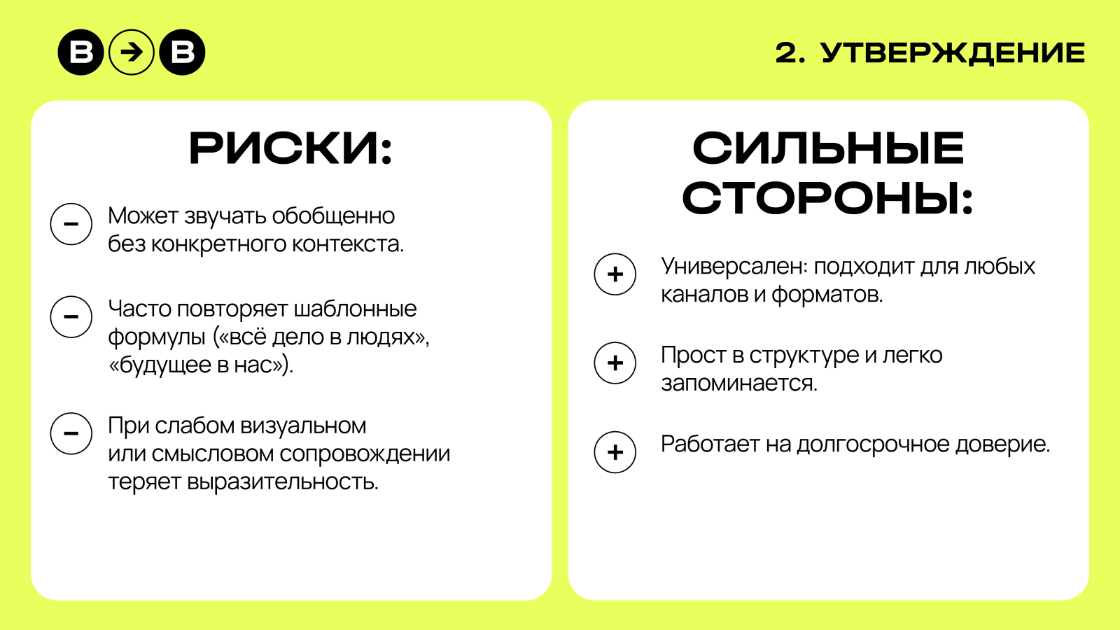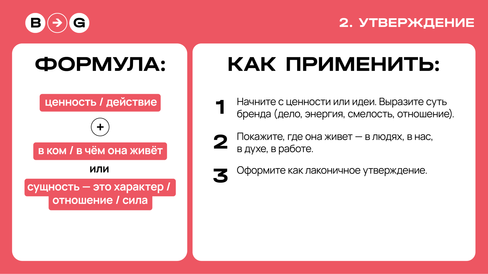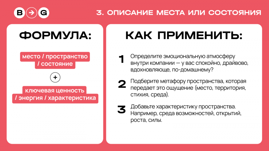 Формулируют убеждение о компании — во что она верит, что ценит и как привыкла действовать. Подходит брендам, для которых важно показать не выгоду, а смысл: не что они предлагают, а зачем существуют.