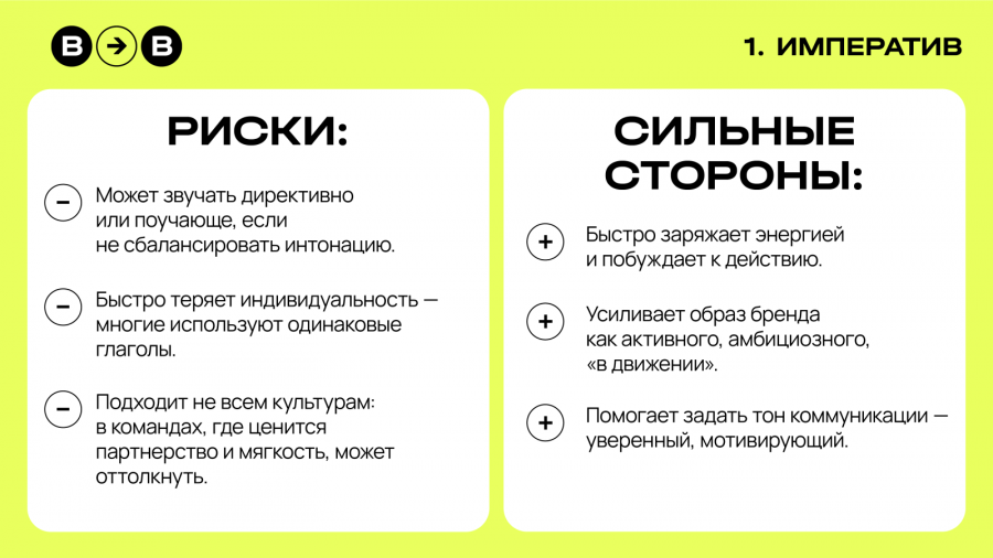 Призывают к действию. Строятся на активных глаголах — работай, создавай, выбирай, подключайся. Такой формат часто используют компании, которые хотят подчеркнуть энергию, лидерство, темп работы.