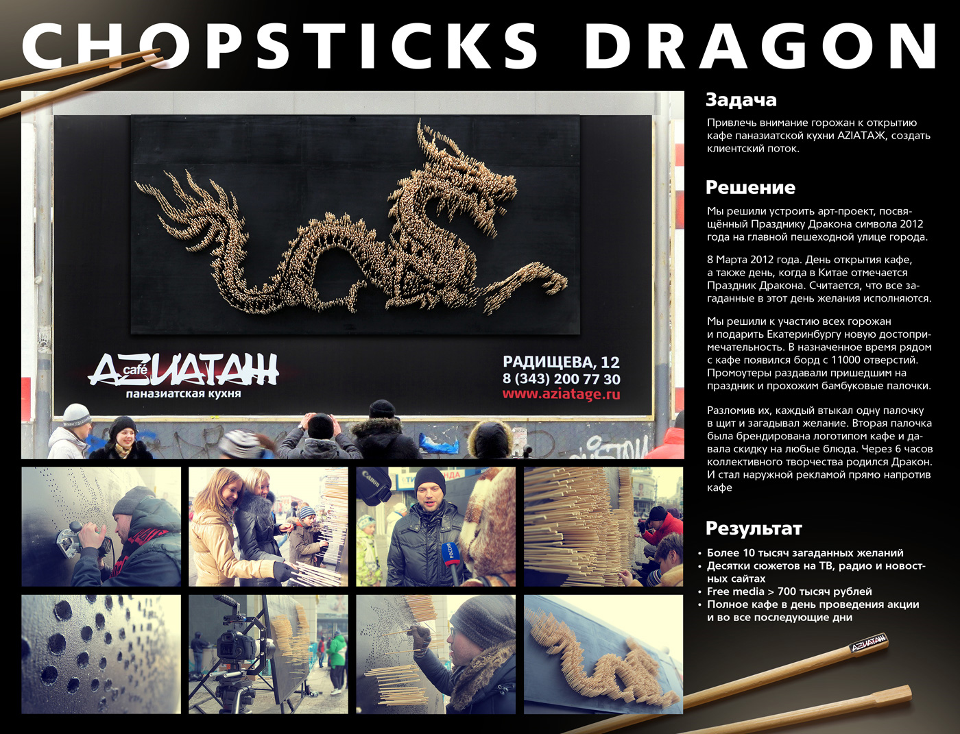 Помимо чиновников, креаторы «Восхода» в прошлом году отметились множеством ярких работ, в числе которых «Дракон из палочек» для ресторана паназиатской кухни «Azиатаж», «Антистрессовые инсталляции» для студии йоги «Арджуна», «Выгодная газета» для Forex-Club, «Синдром ЧБС» для мясокомбината «Кунгурский» и ностальгическое продолжение кампании для комбината «Черкашин».