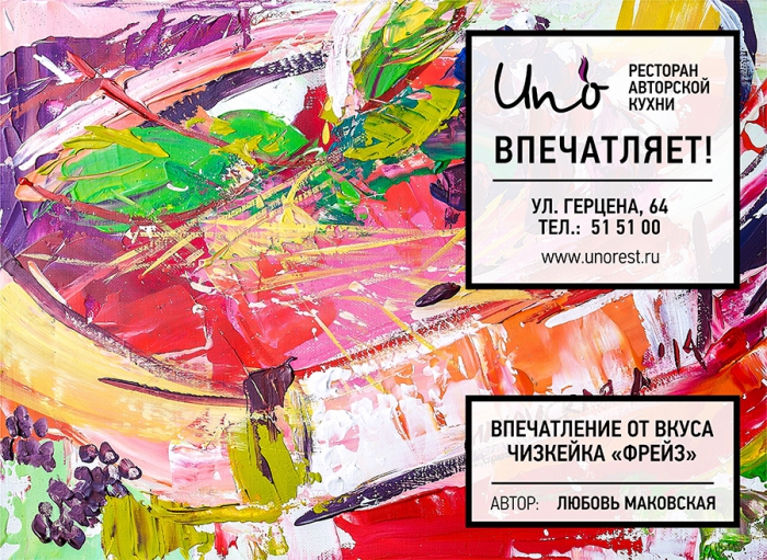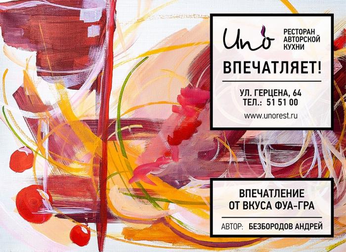 Агентство «Восход» разработало высокохудожественную рекламную кампанию для тюменского ресторана UNO. Основатели ресторана задумывали его как место, с особым характером и харизмой. Это ресторан авторской кухни, где правит звездный повар Феликс Ручаевский, работавший ранее в Корее, Франции, Германии, Канаде.