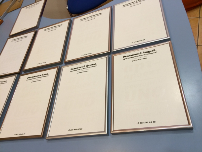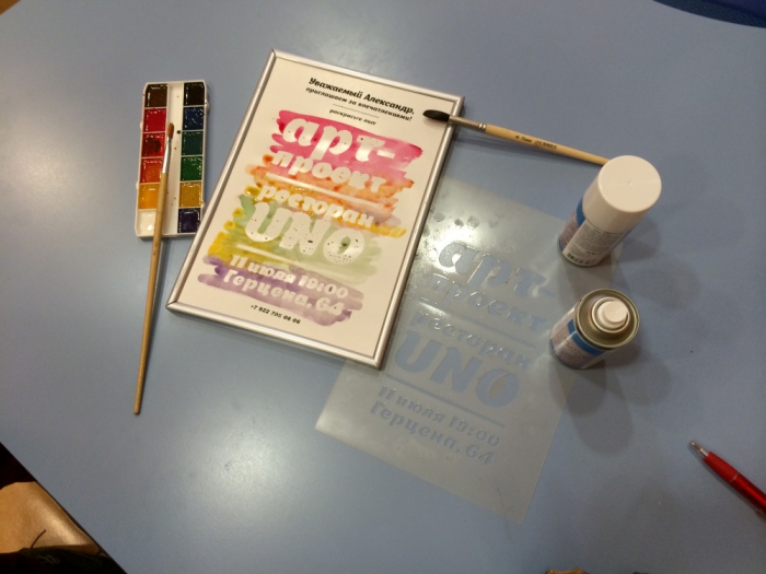 Для гостей праздника агентство создало эксклюзивные приглашения. Творческое приключение начиналось сразу после вскрытия конверта - каждый приглашенный получал небольшой белый мольберт и палитру красок. Секрет мольберта заключался в том, что при нанесении красок на бумагу, на ней проявлялся незаметный ранее текст.