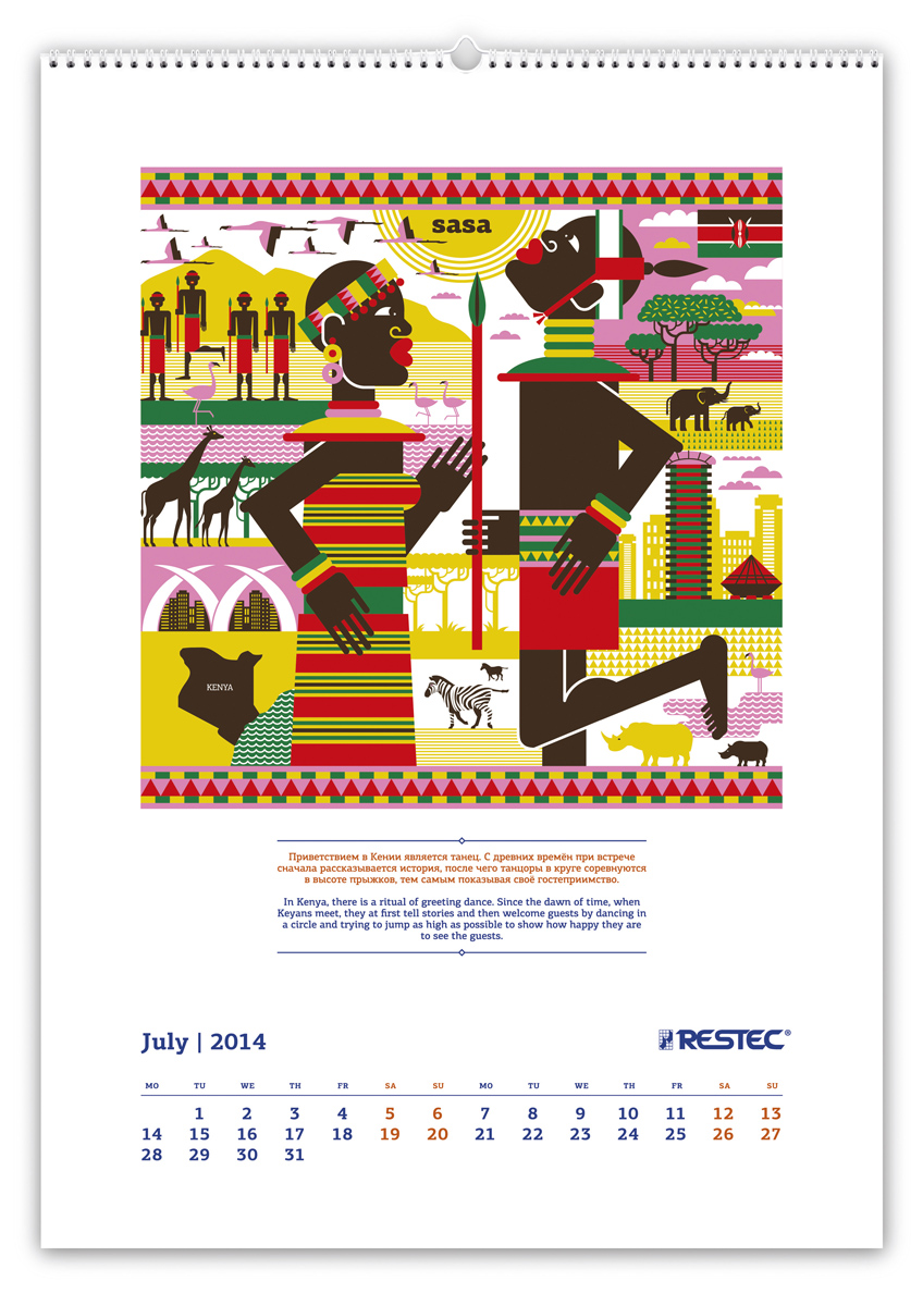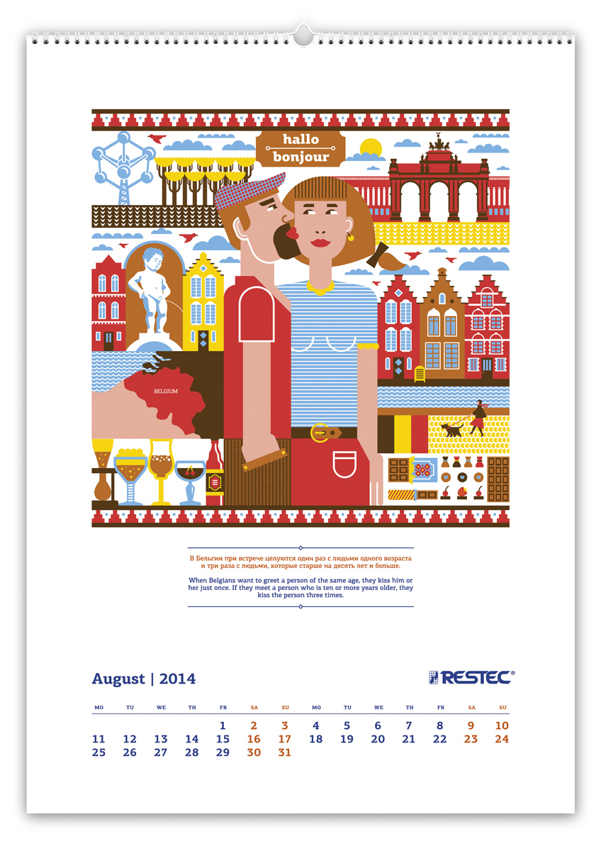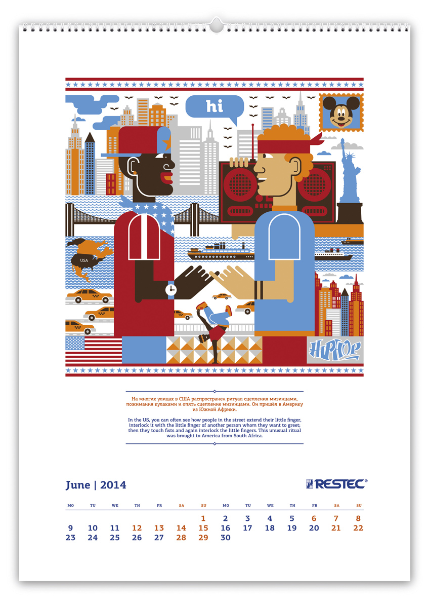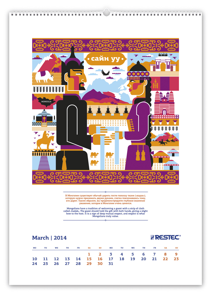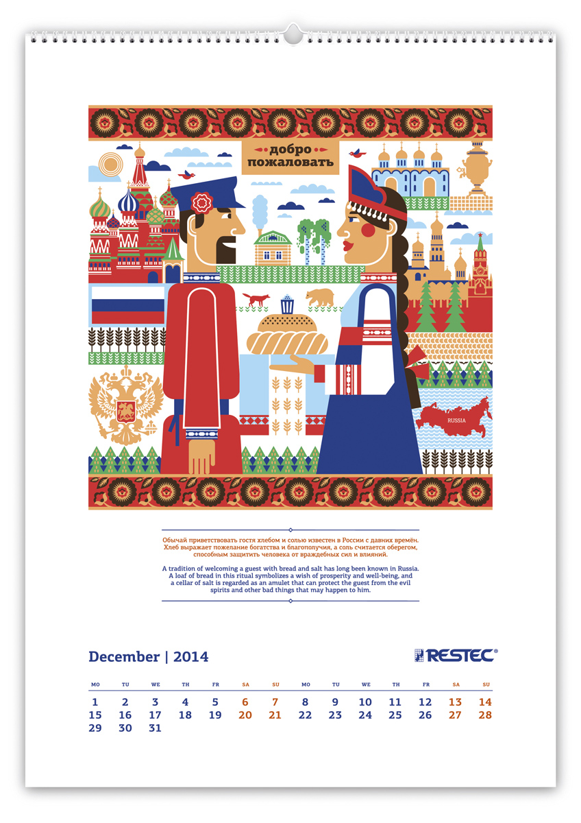 В связи с тем, что компания «Рестэк» занимается организатором конференций как в России, так и за рубежом, лейтмотивом календаря стало приветствие разных стран и народов.