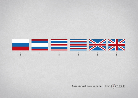 Агентство VOZDUH разработало принт для школы английского языка Five O'clock, рекламирующий пятинедельный экспресс-курс. На макете креаторы изобразили пять шагов перевоплощения российского флага в британский.