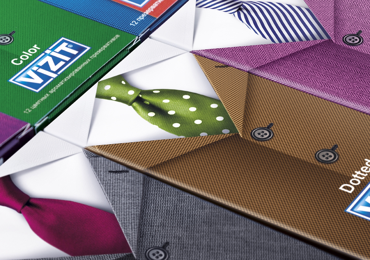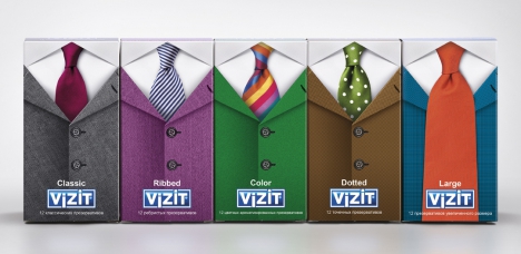 Агентство Vozduh поработало над упаковкой презервативов торговой марки VIZIT. Особенности каждого продукта креаторы проиллюстрировали характерным рисунком на галстуке.
