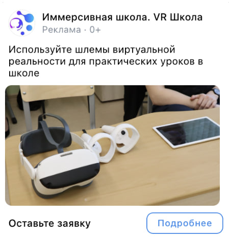 Во всех объявлениях мы использовали одинаковые креативы с фотографиями школьников в шлемах виртуальной реальности, а также изображения с оборудованием.