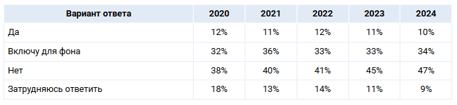 Интересно отметить, что традиция просмотра голубых огоньков с годами теряет популярность — тех, кто не смотрит голубые огоньки и не включает их даже для фона, с каждым годом все больше.