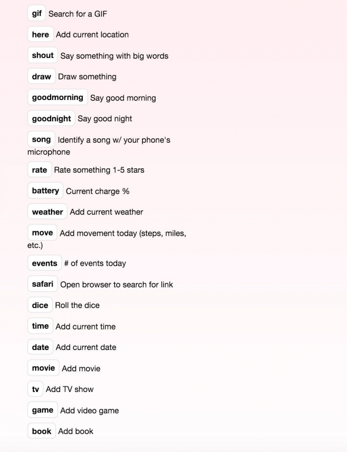 Еще одна фишка Peach - быстрые команды под названием "magic words". На сайте приложения говорится, что это "забавный способ создавать посты". Используя "магические слова" в строке для обновления статуса, пользователь может во всплывающих формах поздороваться с друзьями, рассказать о том, какую музыку он сейчас слушает, на каком мероприятии проводит время и т.д.
