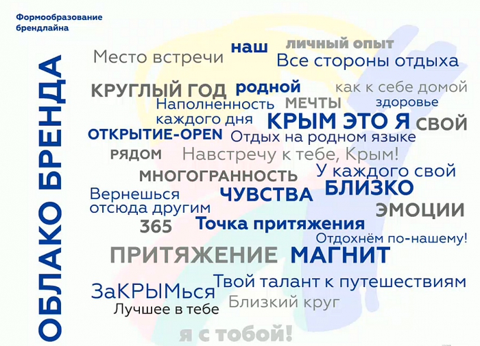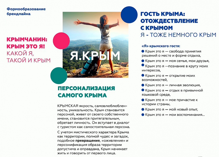 Туристический бренд Крыма состоит из трех частей: платформа бренда, фирменный стиль и графическая часть. Ключевая идея (или бренд-лайн) заключена в его слогане - "Я.Крым. Точка притяжения". Первая часть - "Я.Крым" - призвана персонализировать республику, позволить ей выступать в диалоге с потребителем от первого лица. "Точка притяжения" - символизирует "крымские магниты", те достопримечательности, которыми гордится республика.