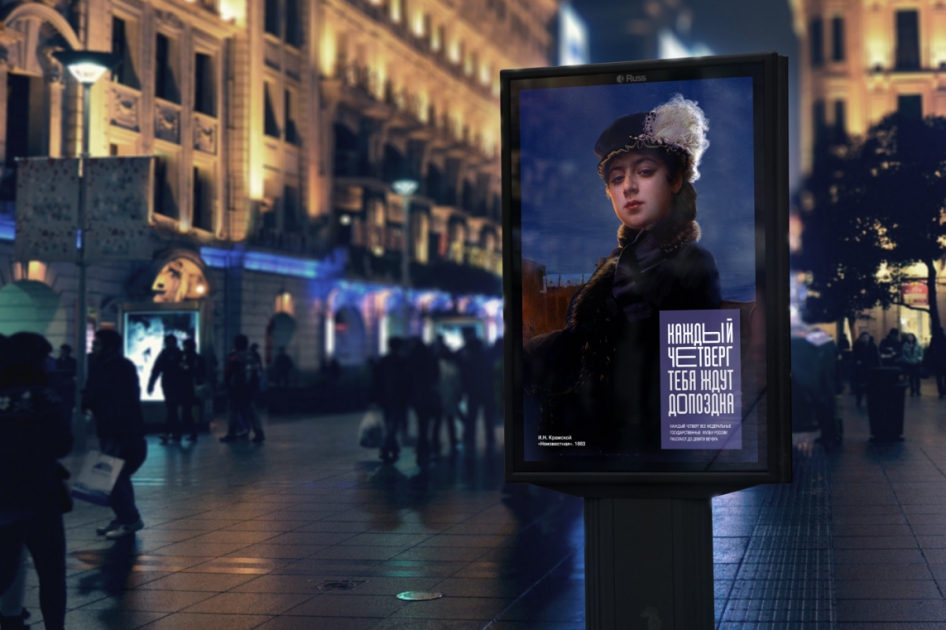 Игра идёт не только в айдентике, но и во всех коммуникациях. Вот, например, как московские музеи рассказывают нам о том, что по четвергам ждут посетителей допоздна. Согласитесь, такими картинками многим захочется поделиться в соцсетях?