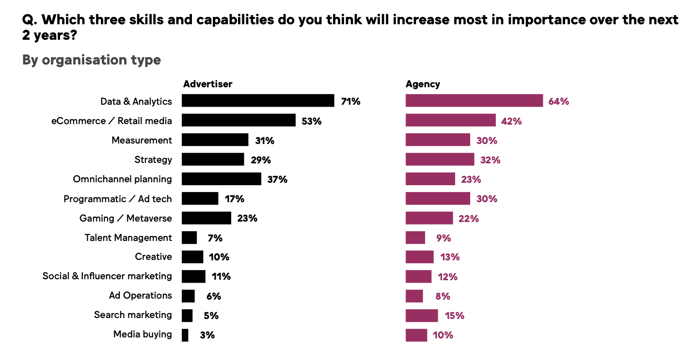 Как показывает Media’s got talent?, дефицит кадров — это не только текущая проблема, но и ключевые приоритеты на будущее. Так, все респонденты к наиболее важными навыками в ближайшие два года отнесли анализ данных. С этим согласились 71% рекламодателей и 64% агентств, что значительно выше показателей по электронной коммерции/СМИ (53% и 42% соответственно).
