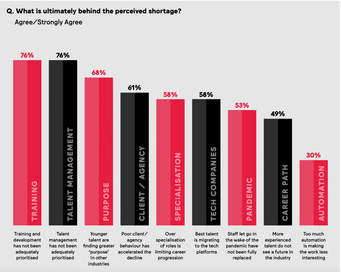 По мнению респондентов, дефицит специалистов сложился из-за плохого обучения (76%) и управления кадрами (76%), чрезмерной специализации (58%) и «переманивания» в IT-сферу (58%). Так, респонденты отмечают, что технологические компании готовы предложить «более щадящий», темп работы и более высокое вознаграждение, чем рекламные агентства и отделы маркетинга.