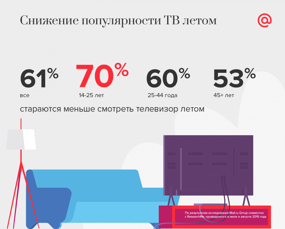 Кроме того, 61% участник исследования заявил, что летом сокращает потребление ТВ-контента и использование других развлекательных ресурсов. Причем среди молодежи (14−25 лет) доля таких людей значительно больше, чем среди старшего поколения в возрасте 45+ лет.
