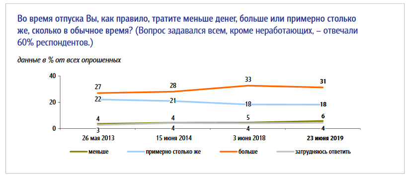 Согласно опросу ФОМ, за границей провели отпуск всего 5% россиян. 37% из тех, кто ездил за границу назвали свой отдых дорогим. 31% сообщили, что тратят во время отдыха больше денег, чем обычно, 18% - примерно столько же. Копят на отпуск 25%, не копят — 32%.
