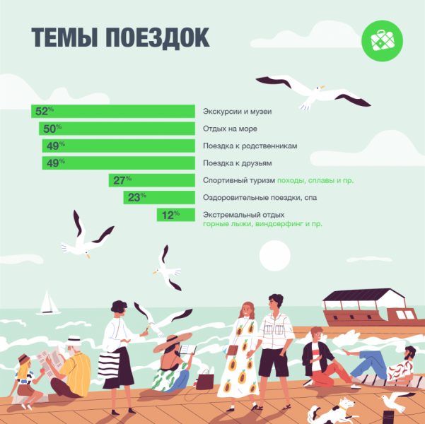Этим летом россияне с практически одинаковой популярностью сочетали культурный отдых с посещением музеев и экскурсий, пляжный отдых и поездки к родственникам и друзьям. Среди направлений лидирует юг России, включая Крым: туда в течение последнего года ездили 43% опрошенных. На втором месте по популярности Санкт-Петербург, немного уступает ему Москва: эти города посещали 28% и 27% опрошенных соответственно.
