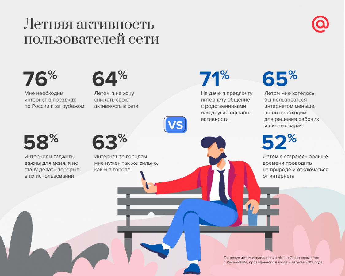 Те россияне, которые провели лето на даче, скучали по интернету и доставке еды. О том, что на даче хочется использовать интернет активнее, заявили 62% опрошенных. Больше половины респондентов (59%) хотели бы пользоваться интернет-сервисами, которыми обычно пользуются в городе. Однако россиянам близка идея летнего диджитал-детокса. Чуть больше половины пользователей рунета (52%) сказали, что летом стараются отключаться от средств связи и проводить больше времени на природе. 71% ответили, что предпочли бы интернету общение с родственниками или чтение книги.