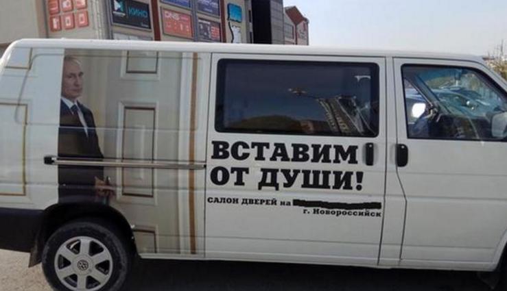 На улицах Новороссийска появилась необычная реклама. Компания, занимающаяся продажей и установкой дверей, разместила на фургоне доставки фотографию президента России Владимира Путина в сопровождении слогана «Вставим от души».