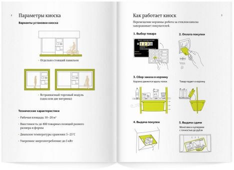Киоски устанавливаются в пешеходных зонах и городских парках Москвы, в вестибюлях метро и переходах, на парковках и в аэропортах, а также легко комбинируются с остановками наземного транспорта. Об их возможностях и порядке совершения покупок понятно и наглядно рассказывает внешнее оформление. Чтобы все киоски выглядели одинаково хорошо, составлено руководство по их оформлению.